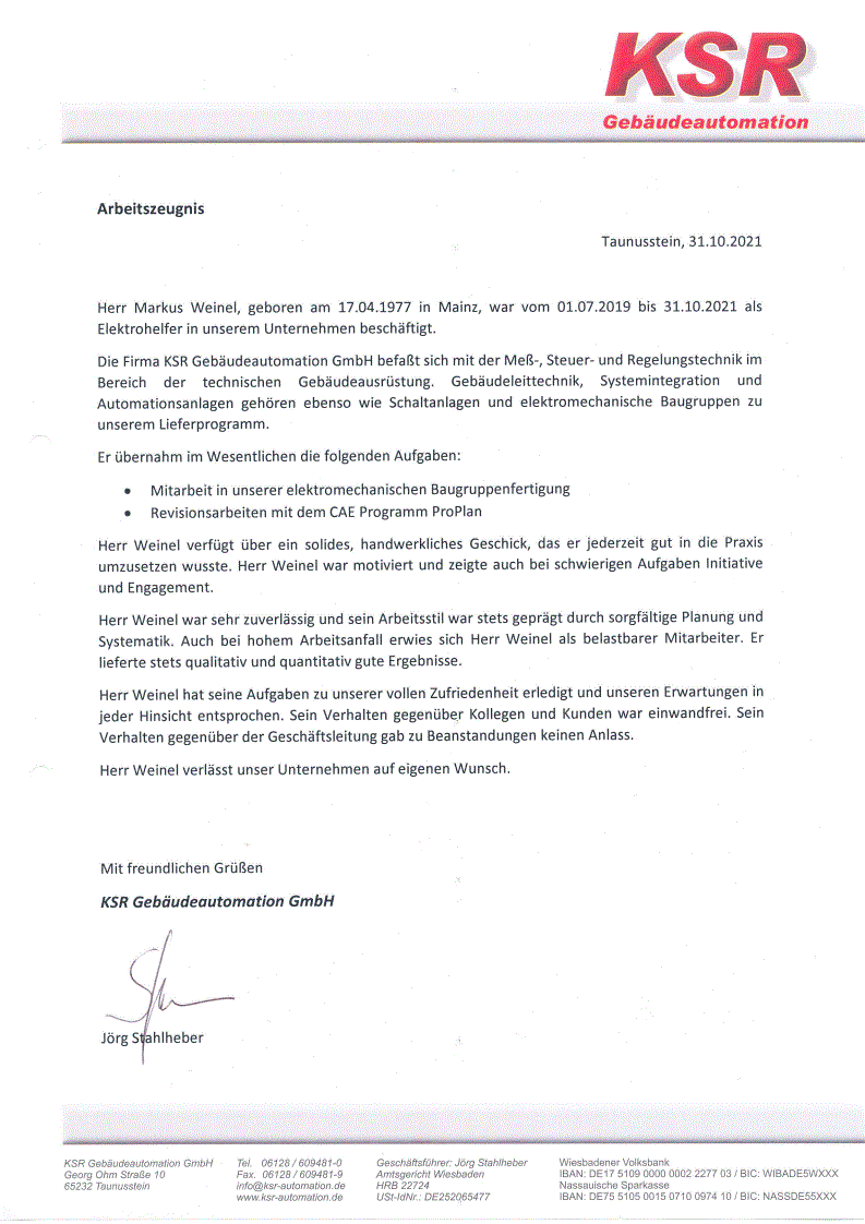 Arbeitszeugnis KSR Gebäudeautomation GmbH [klicken zum vergrößern]