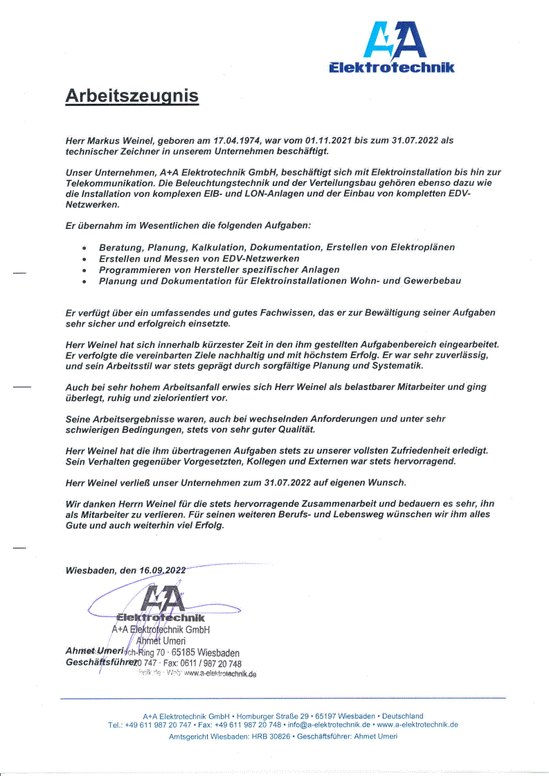 Arbeitszeugnis A+A Elektrotechnik GmbH [klicken zum vergrößern]