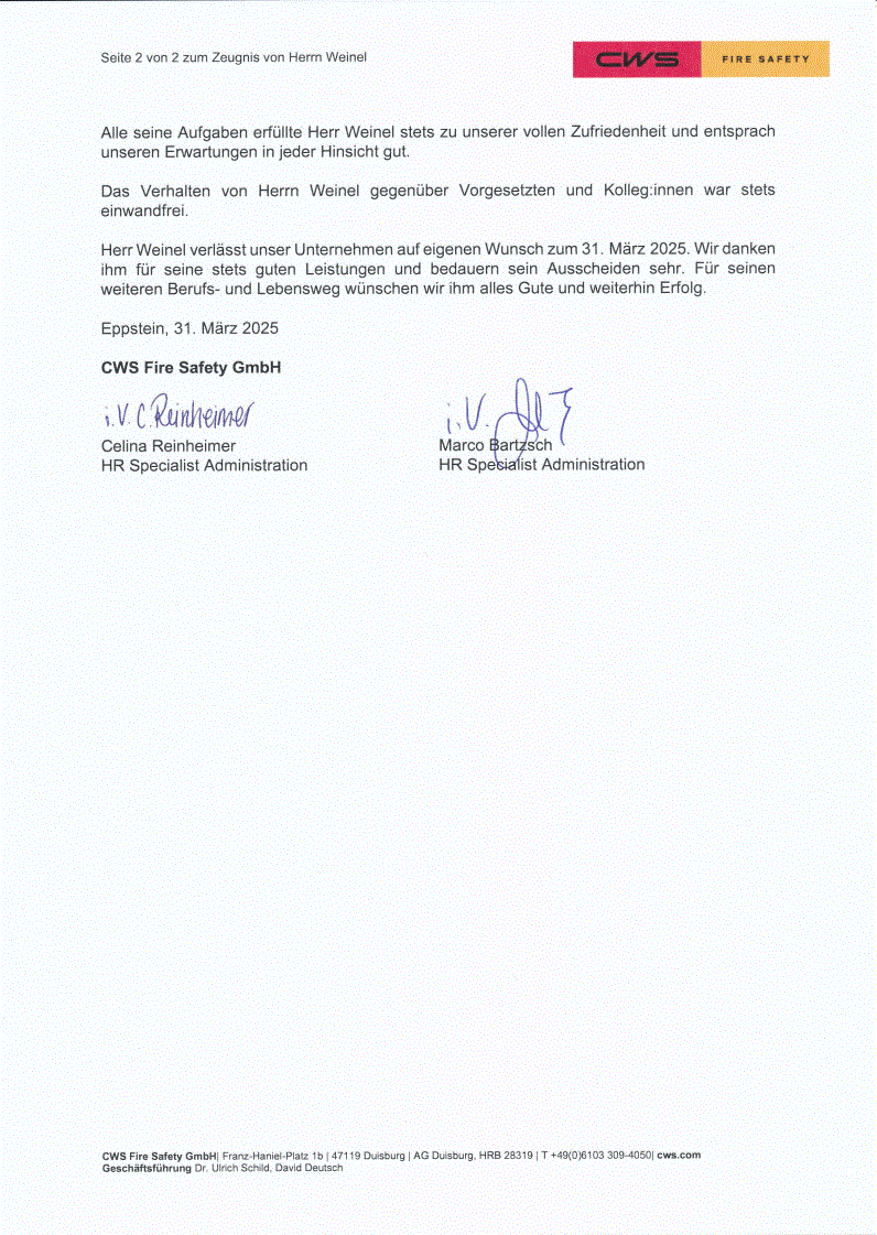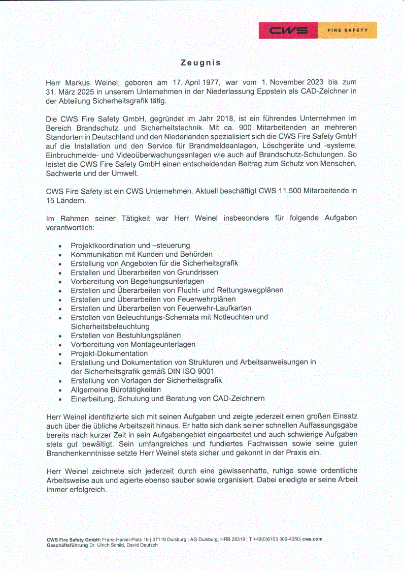 Arbeitszeugnis CWS Fire Safety [klicken zum vergrößern]